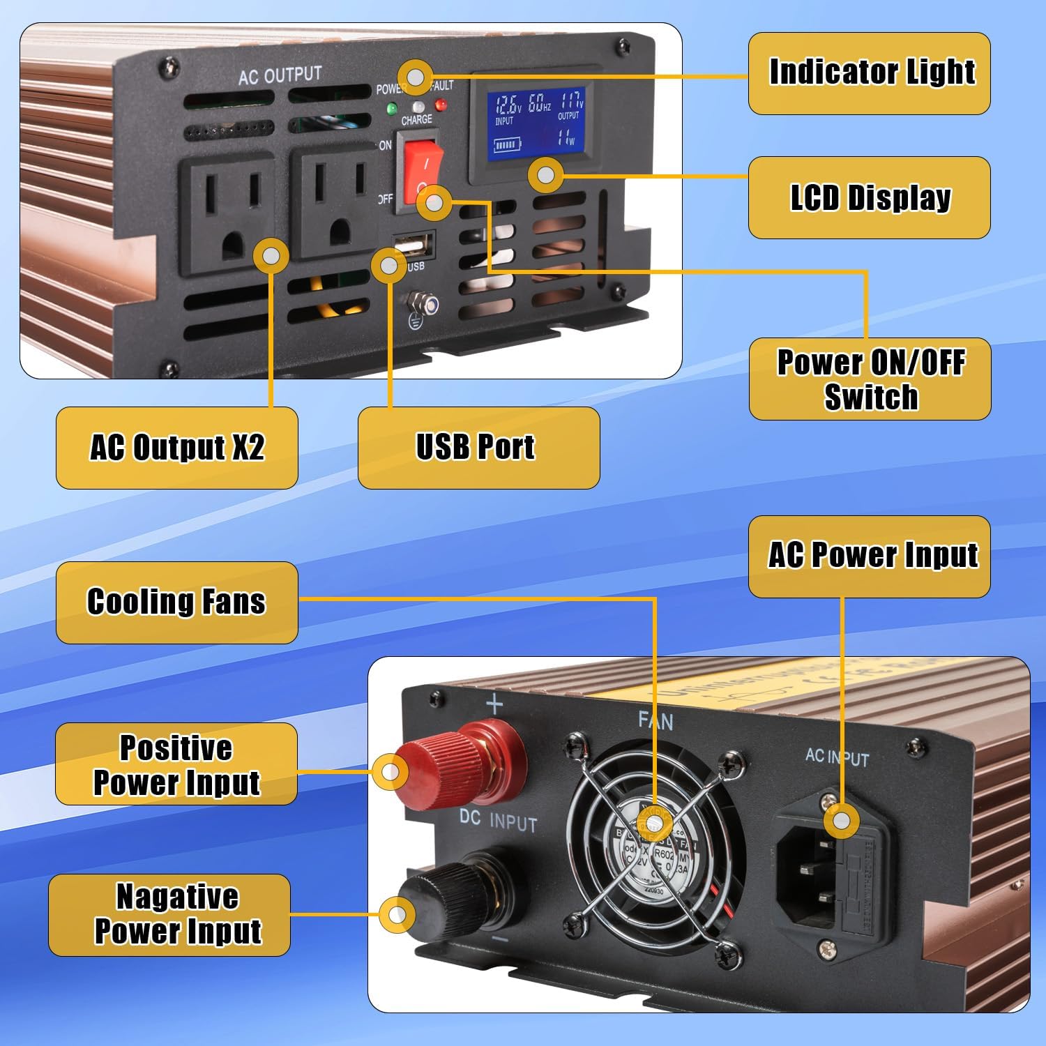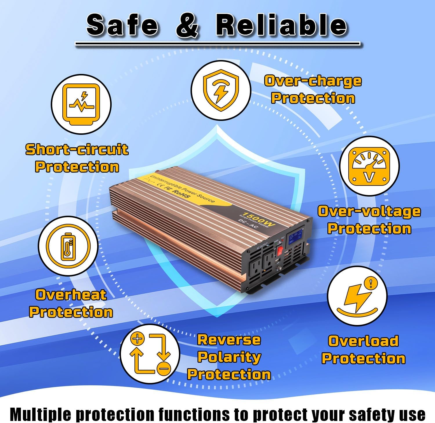 Excellent Performance LCD Display Six protection functions Flexible Installation Method Built-in cooling device Enough to power two primary sump pumps simultaneously.