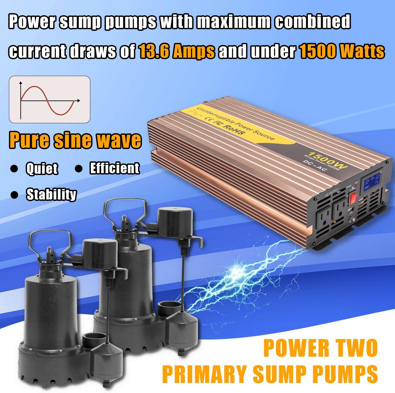 It powers your primary sump pump with a pure sine wave voltage of 120 VAC, securing its continuous operation.