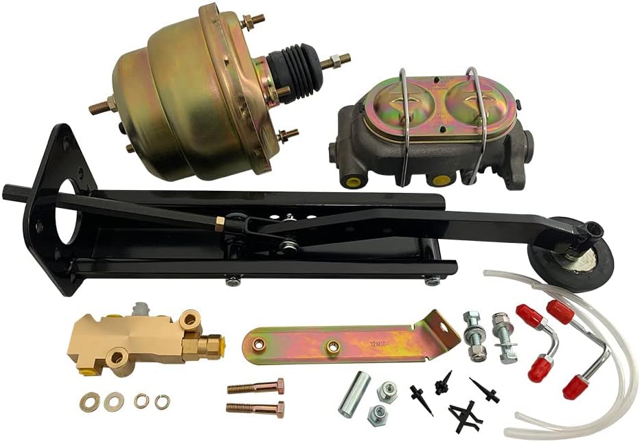 Complete package includes universal firewall mounted pedal assembly, 7″ dual booster with a sleek zinc finish, and 1″ bore GM cast iron master cylinder with 9/16″ and 1/2″ ports on each side!
