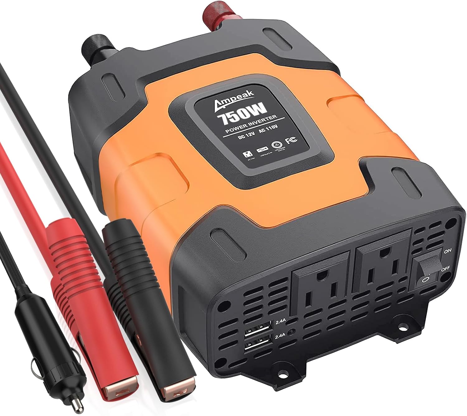 Ampeak 750W Inverter: 750W continuous power (1500W peak), 2 AC outlets, 2 USB ports (2.4A each), and battery cables included—reliable car power inverter 12V DC to 110V AC conversion for your essential devices.