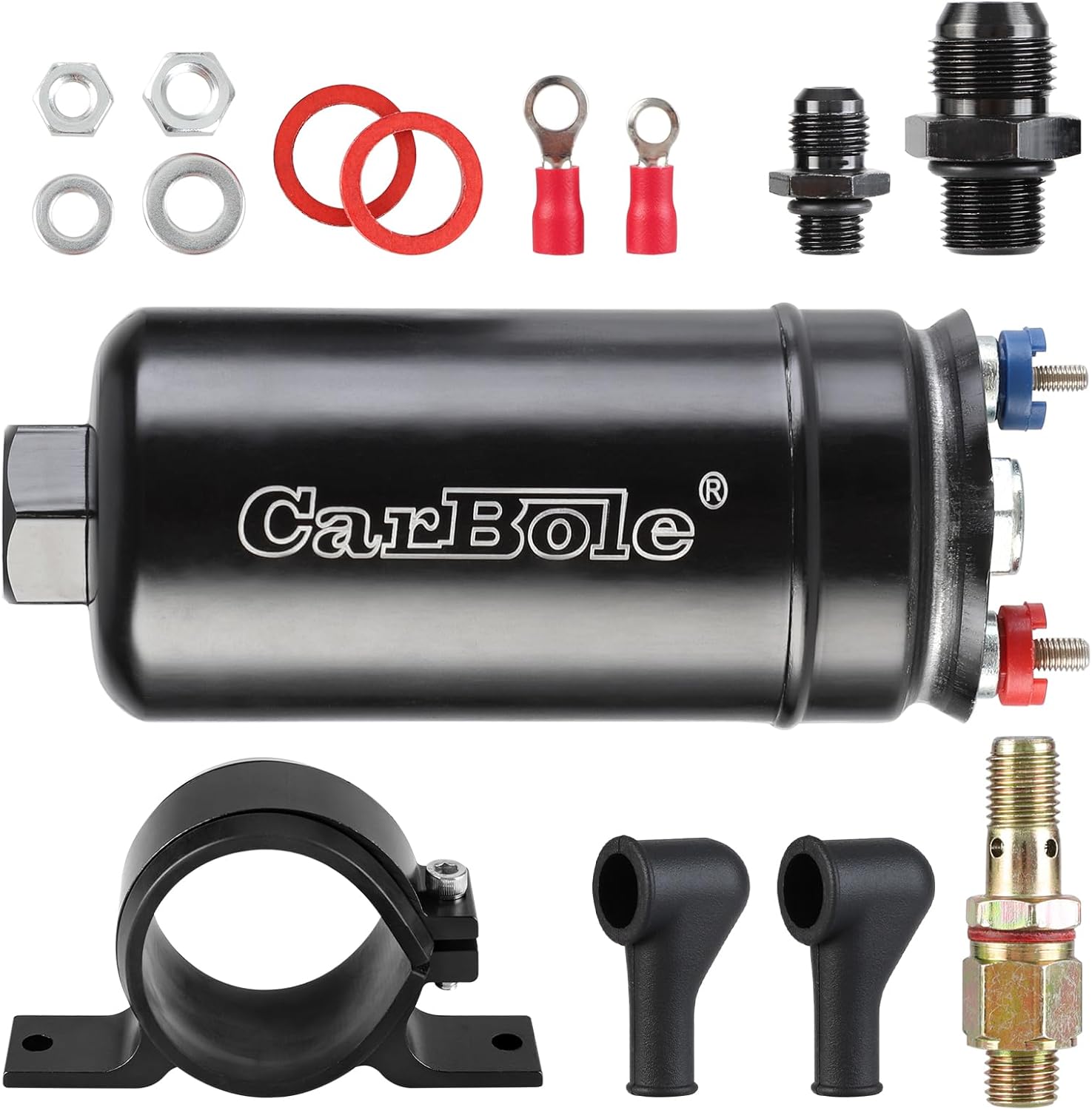 300LPH External Fuel Pump ×1, Mounting Clamp ×1, Bolt For Bracket ×1,Rubber Connection Cover ×2, insulated terminals ×2 , Nuts ×2, Gasket ×2,Outlet Check Valve ×1, 6AN Male Outlet Adapter ×1, 10AN Male Inlet Adapter ×1