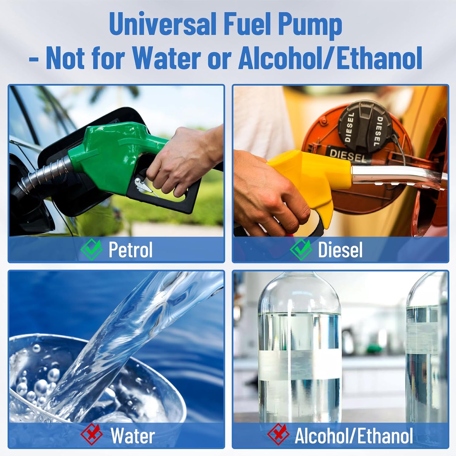Universal Fit for DC 12V Electronic Fuel Injection System(EFI system):Can be use use with Diesel & Gasoline, but it is not recommended to applicable with alcohol /E85 fuels which may diminished working life of pump