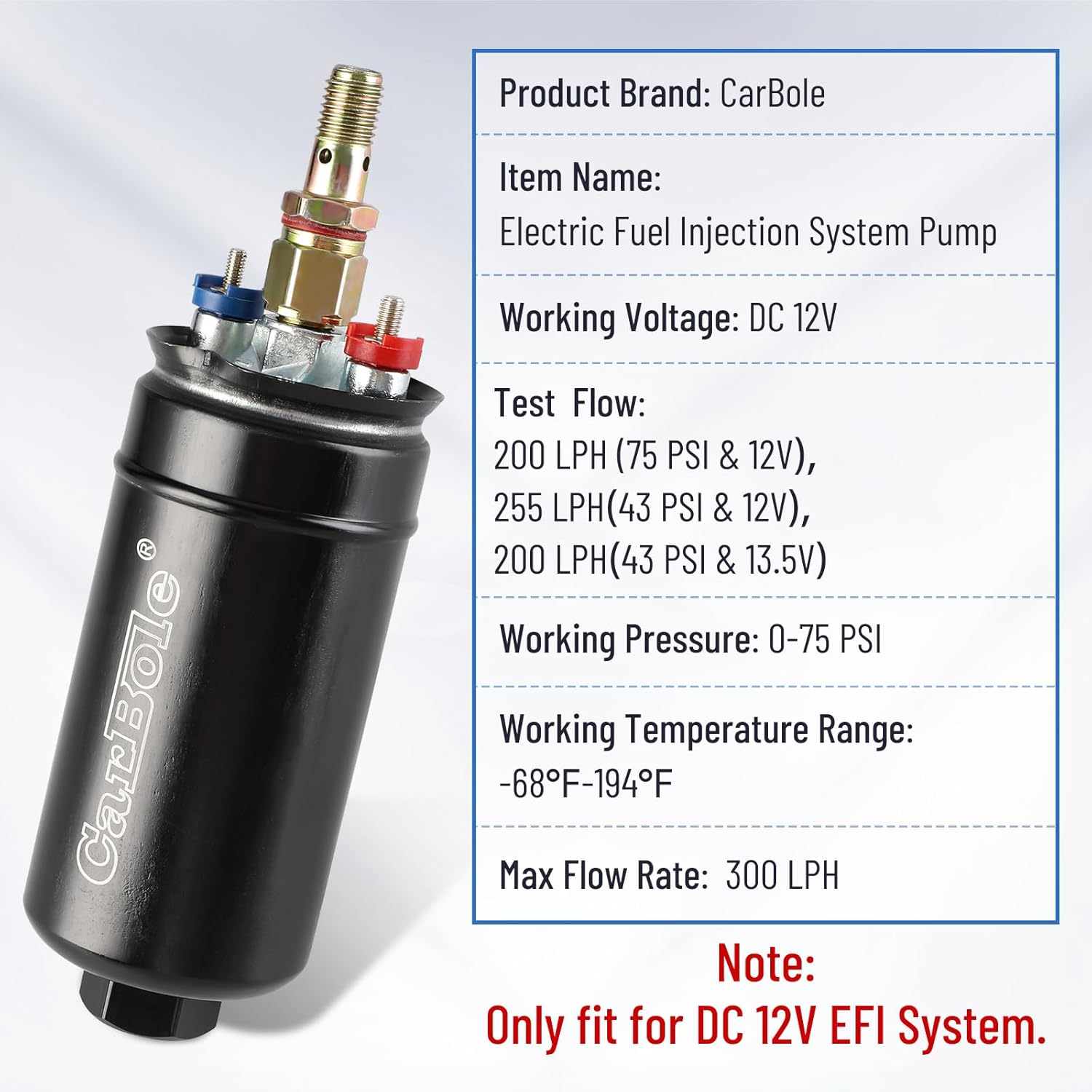 CarBole Universal Electric External Inline Fuel Pump, 12V 300LPH High Flow Rate