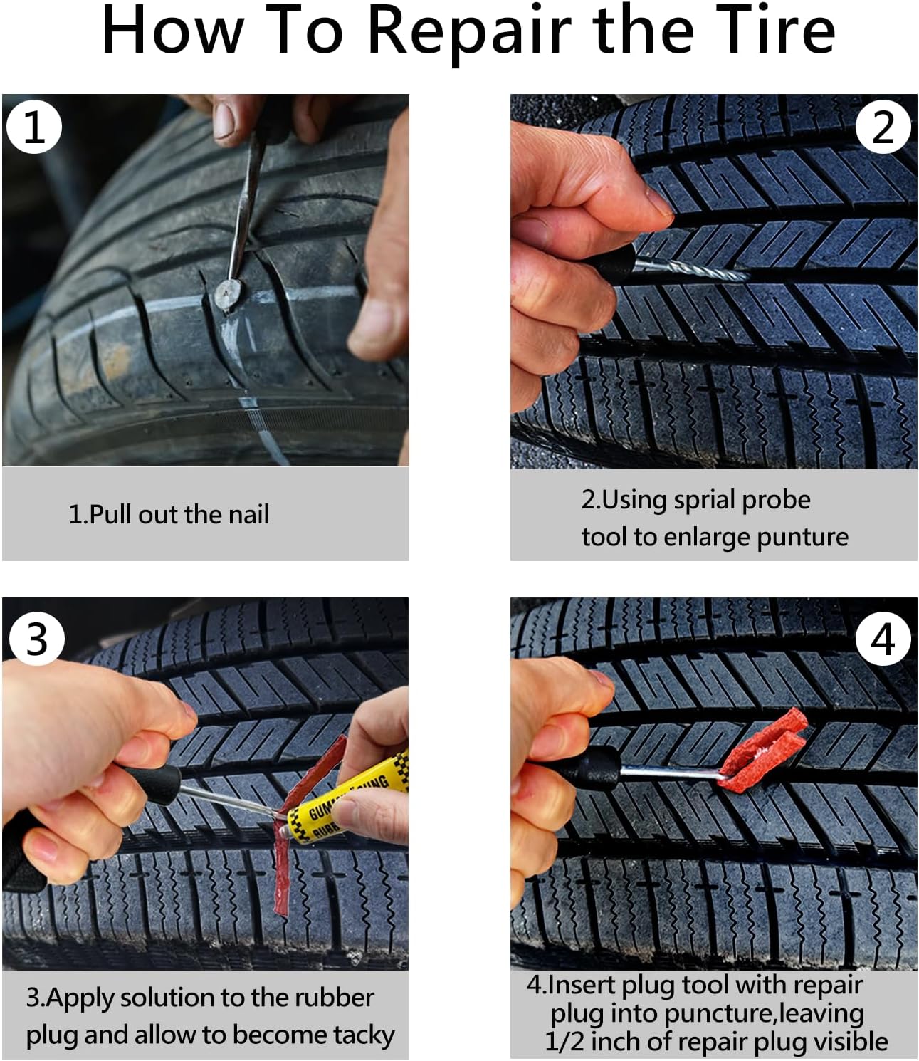 Universal Tire Emergency Kit:The heavy duty professional tire repair kit can help you get back on the road quickly when you get a flat tire.The tire repair kits are equipped with the necessary tools,including a T-handle,repair plugs, lubricant ,etc.