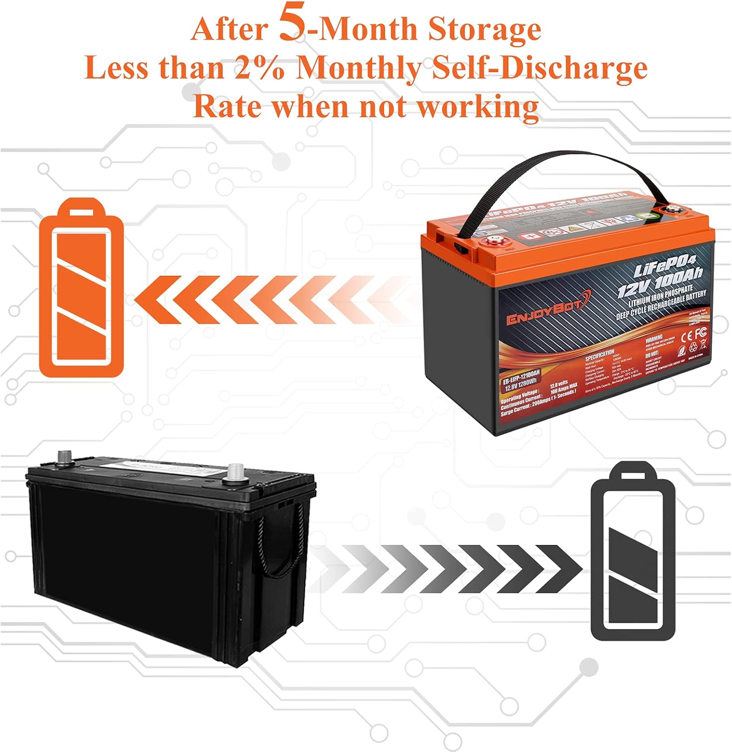 95% High Efficiency: Enjoybot LiFePO4 Battery’s flat discharge curve holds above 12V for up to 95% of its capacity usage, providing astronomical boosts in run-time compared to only 50% in Lead Acid; Lifepo4 battery is also safer than Lead Acid batteries, which have no protection against ground faults; Enjoybot 12V Rechargerable lithium ion phosphate battery is IP65 Waterpoof