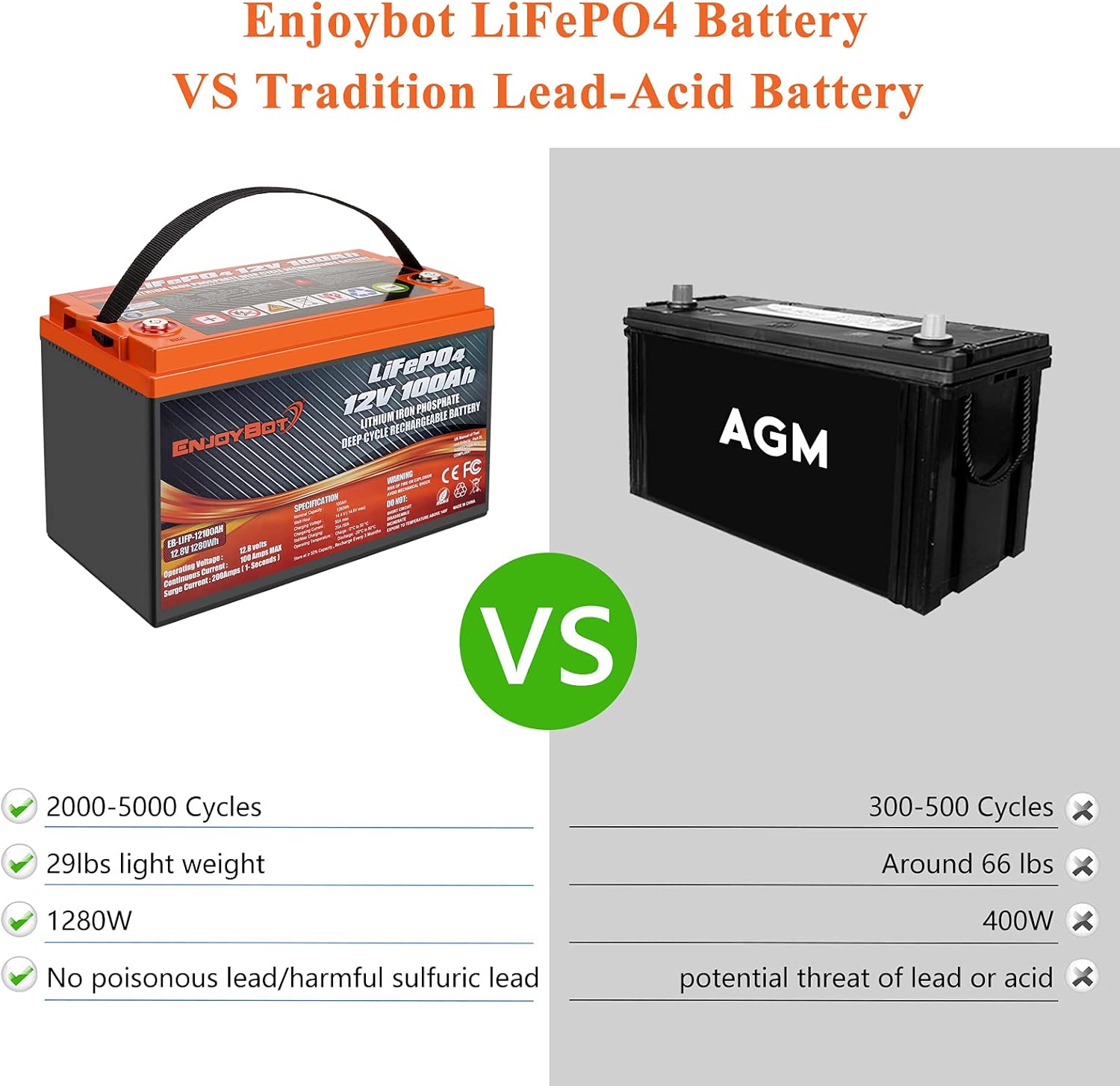 Prolonged Durability & 2000+ Cycles: With 1C charge and discharge, Enjoybot LiFePO4 deep cycle battery provides 2000-5000 cycles and has a remarkably long operational life, compared to 200 – 500 cycles & a 3 years lifetime in typical Lead Acid batteries; Perfect replacement for AGM SLA battery