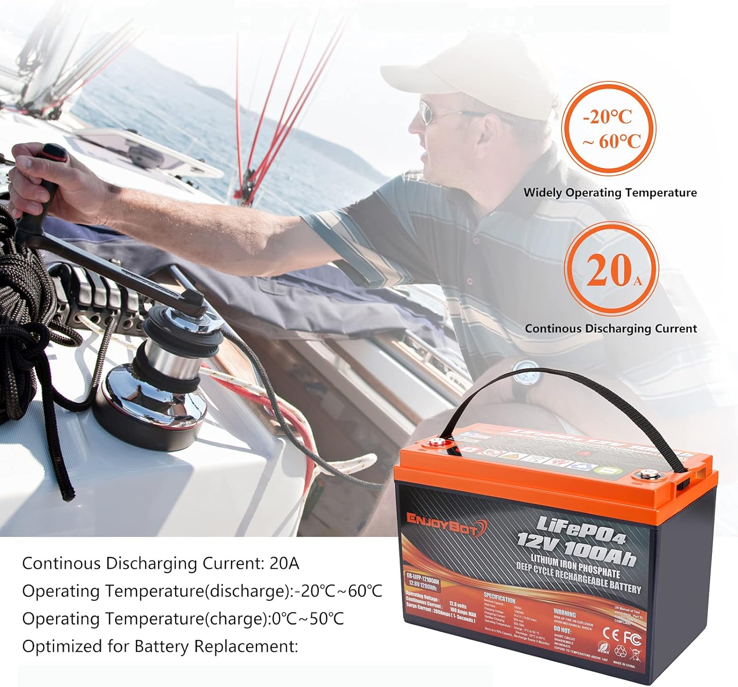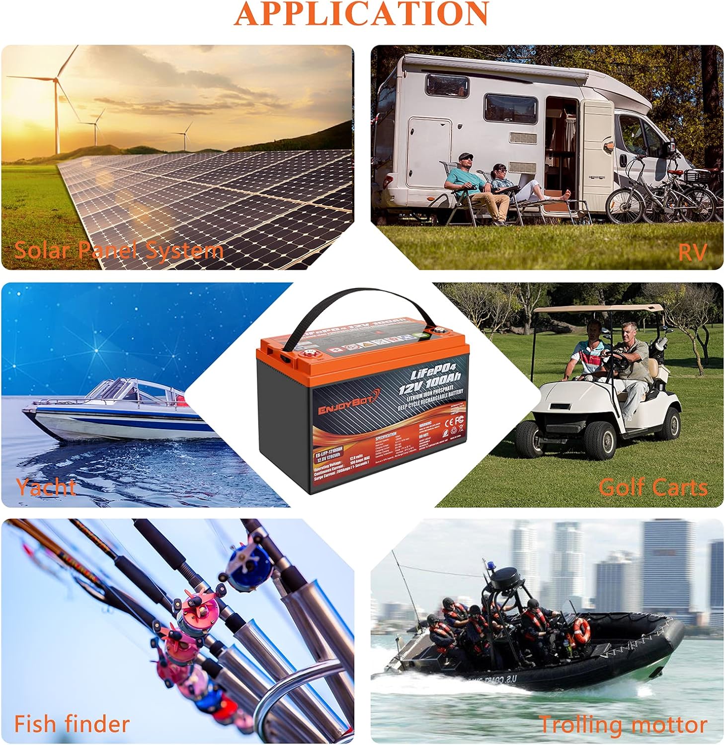 Perfect Replace for Lead-Acid: With Automotive Grade Cells, Enjoybot LifePO4 Battery can be used for Marine, Car, Golf car, RV, Solar power System, Home Energy Storage, UPS backup, Trolling Motor, Boat, lighting, digital/CCTV cameras, TV, e-Robot, electric vehicles, DIY loud speaker, 12V router, air pump, air conditioner, fish finder, motorhome & camper, Houseboat, Car Audio, Travel Trailer, Dump Trailer, Scooter and etc.
