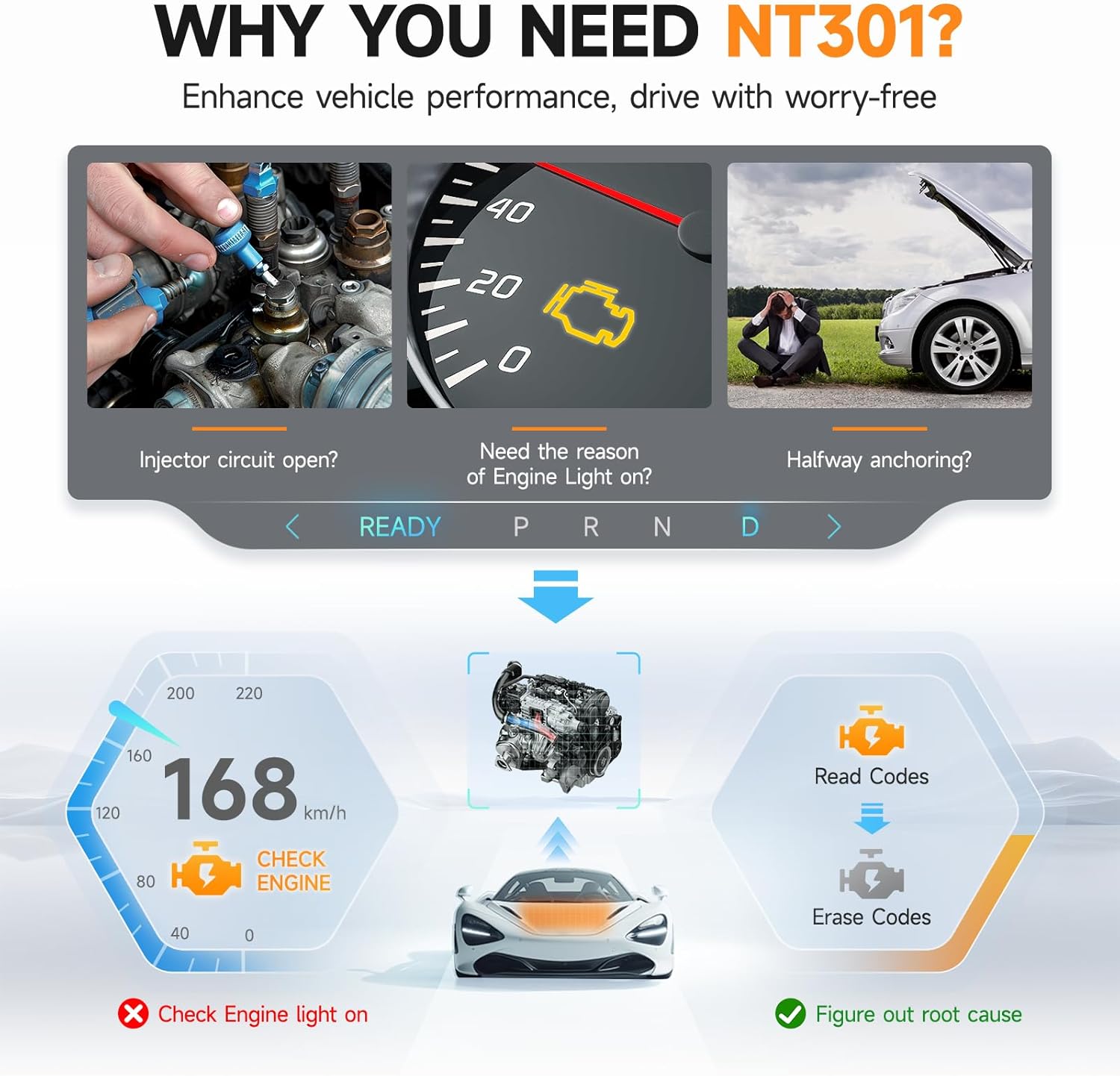 [Vehicle CEL Doctor] The NT301 obd2 scanner enables you to read DTCs, access to I/M readiness status, figure out the root reason of check engine light or MIL turned on, monitor sensors test, read live data and retrieve VIN of your vehicle. The fault code only can be cleared after repair finished by NT301, as like all the obd2 code readers’ working principle