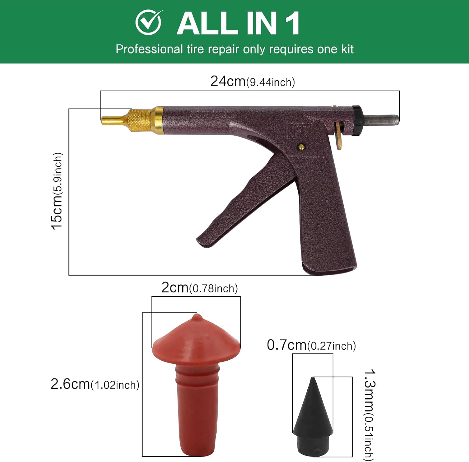 【Universal Tire Puncture Repair Kit】 includes 1 x Tire Plug Gun, 1 x Long Awl, 1 x Cartoon Board, 2 x Nozzles, 1 x Pack of Bullets, 1 x Bottle of Lubricant, 1 x Instruction. Meet all your needs on tire repairing work totally.