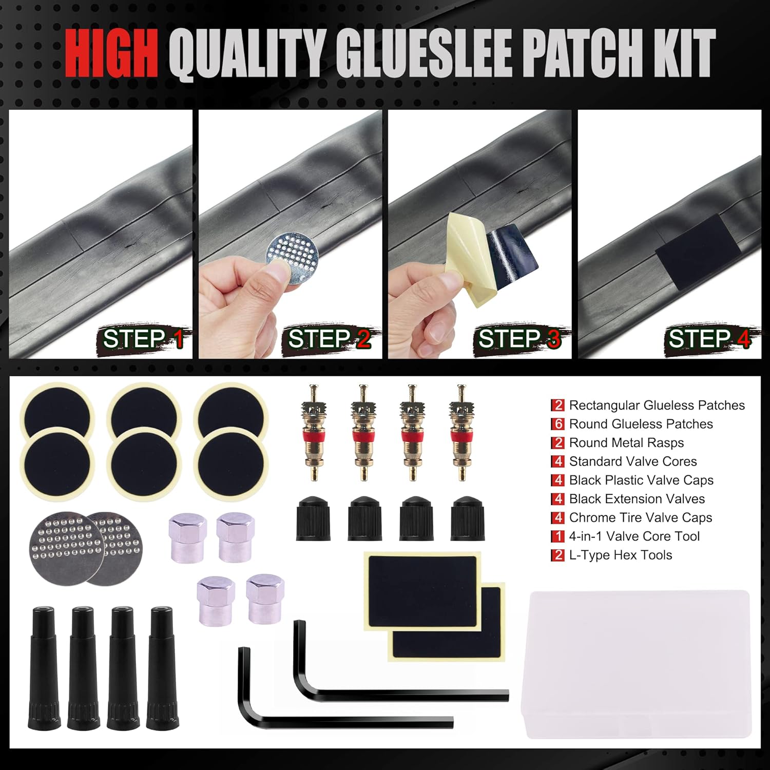 AWELCRAFT tire repair kit is a portable and practical kit in your car or garage. All goods are packed in a durable case. This portable case provides quick access, well organization and easy carry.