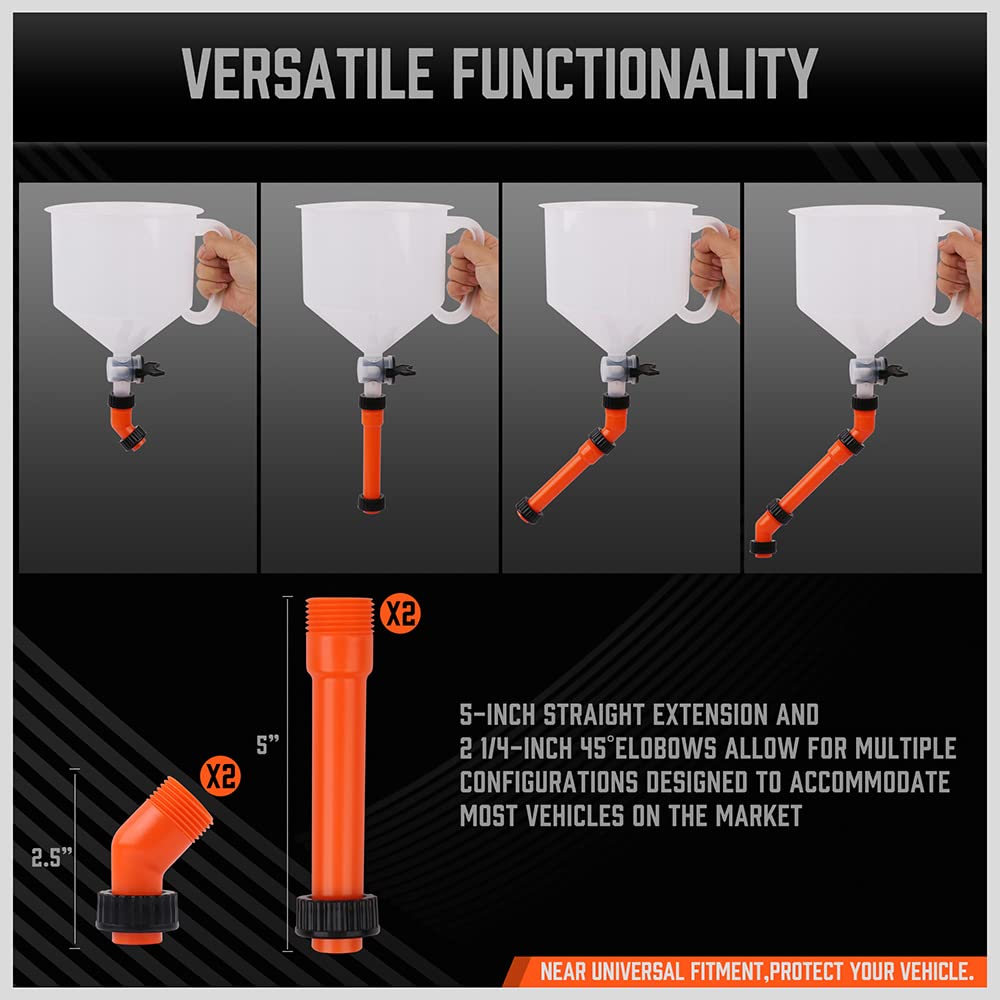 The multipurpose funnel kit contains 5 Adapters, 4 Filler Caps, Two 45° elbows, Two 5“ extender and a thick transparent antifreeze funnel .