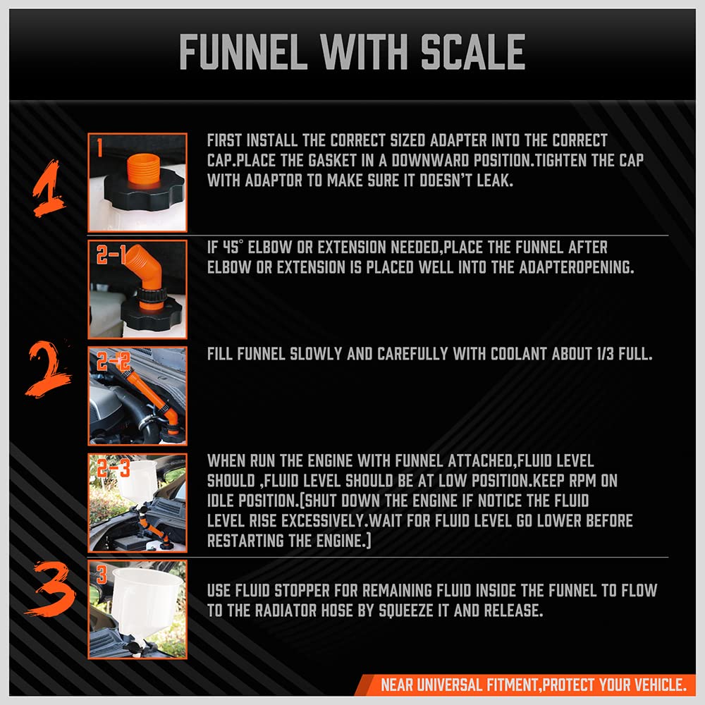 The Spill Proof Coolant Filling Funnel Kit can deliver fluids and oil to vehicle, the long burp funnel prevents spills and trap air during refills after a coolant flush.