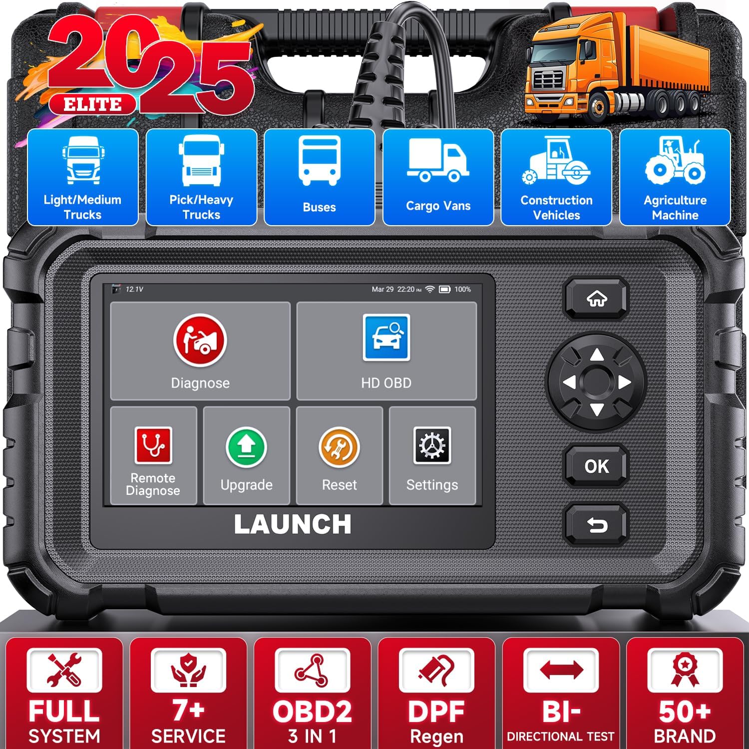 🚜【2025 Top-level Diagnostic Tool, Ideal for Commercial Vehicles】: LAUNCH 129HD heavy duty truck scanner is supports more than 50+ vehicle models, such as light/heavy truck, pickup, buses, trailer, tractor, dumper, agricultural and construction vehicles. It delivers such as DPF regen, speed limit adjustment. 129HD also includes 7+ special services, full system functions, EOBD/HDOBD/OBD2 functions, graphing live data, data screenshot/feedback/Email, 2 year free-update and 24/7 customer service.