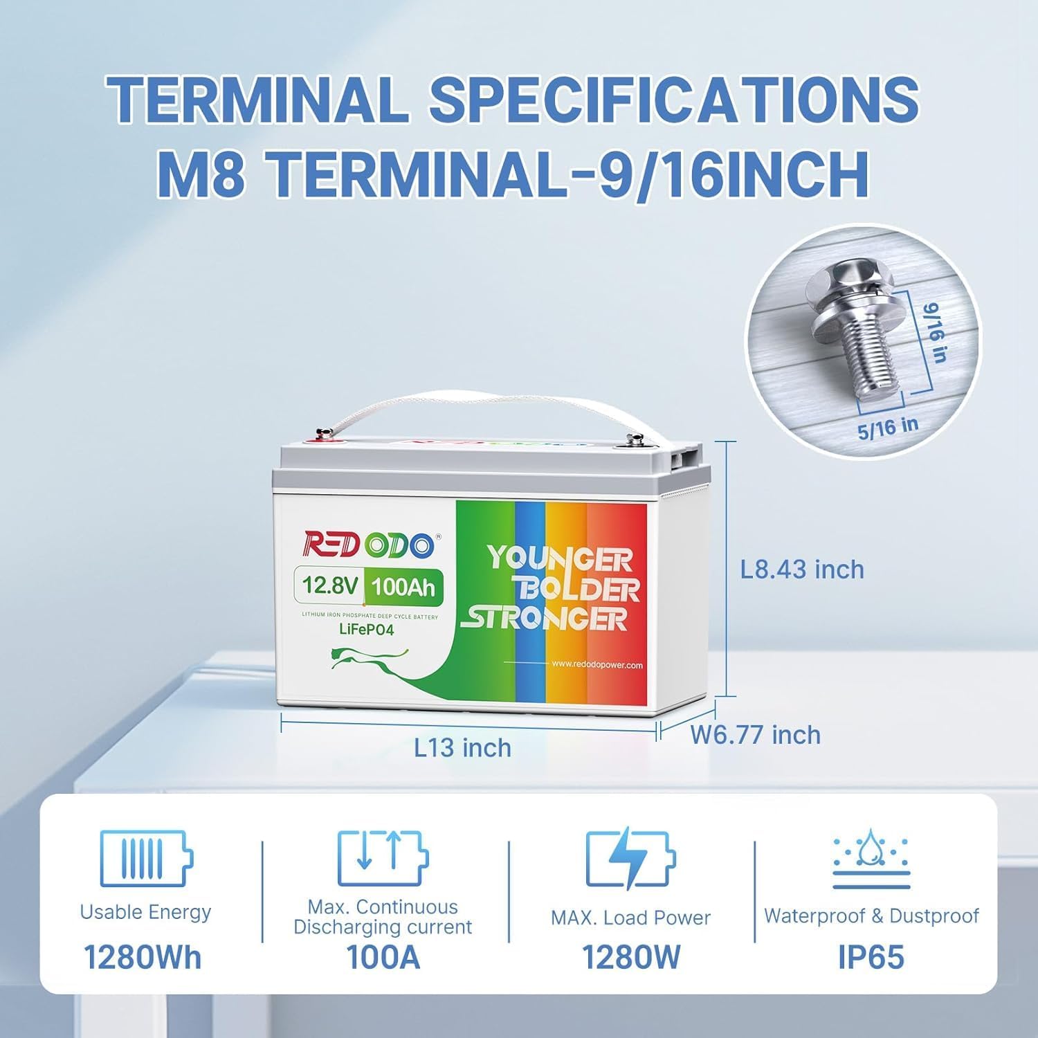 【1/3 Lightweight & 2.5X Higher ED】Redodo lithium battery 12V 100Ah measures L13*W6.77*H8.43 inches which perfectly suits for Group 31 battery box (5% minor for operability), and weighs only 22.04 lbs, only 1/3 weight of 12V100AH lead acid batteries (63.89 lbs). At the same capacity, the ED(energy density) of Redodo 12V 100Ah battery is 50.4Wh/lb, far beyond the ED of agm battery which is 20Wh/lb. Compact desigh with outstanding performance.