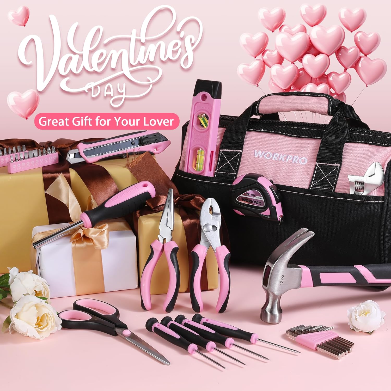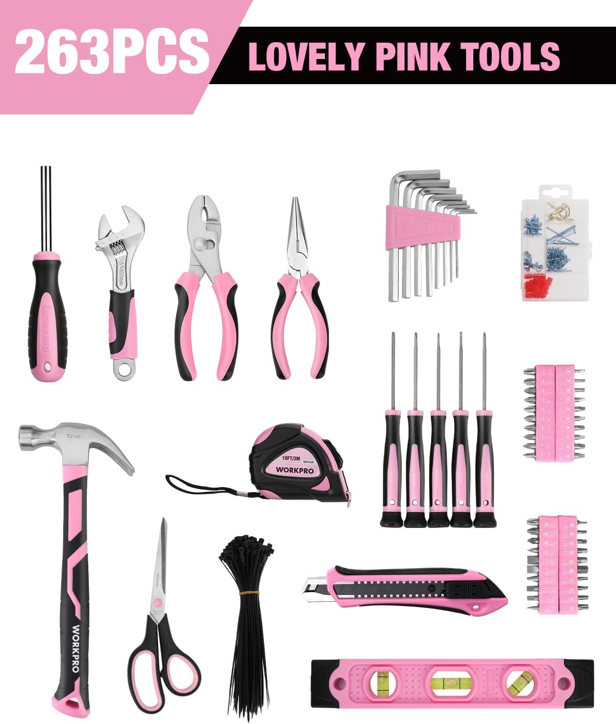 WORKPRO Pink Tool Kit, 263-Piece Home Repairing Tool Set with Wide Mouth Open